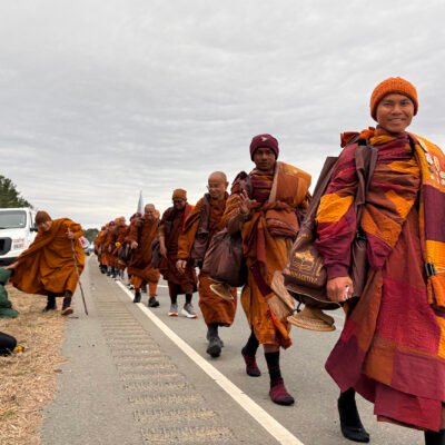 APEX, N.C. (RNS) — Their bright saffron robes and shoulder bags standing out against a cloudy sky, 18 Buddhist monks walked in a single file